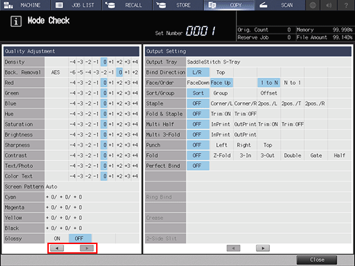 The current settings of [Output Setting] and [Application] are displayed in the right side area of the [Mode Check] screen. To switch the display, press [