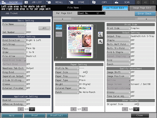 • Press [Proof] on the [Job Ticket Edit] screen to output a sample set. Pressing [Proof (1st)], if displayed, will output only the first sheet of the whole set.