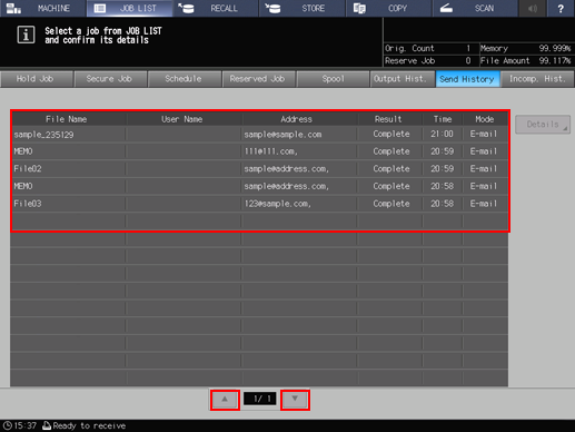 Up to 100 jobs are displayed in [Output Hist.], [Send History], and [Incomp. Hist.] in total. When Image Controller IC-603 is mounted on the machine, jobs are retained even if the machine is turned off.