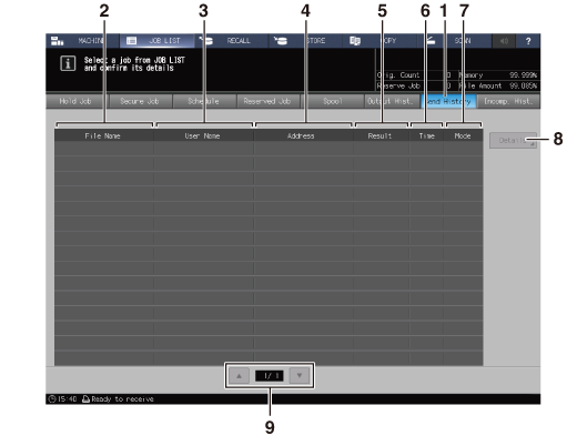 7 | [Mode] | Displays the mode (E-mail/HDD/FTP/SMB/WebDAV/Queue*1/USB*2/TWAIN) of the send job. When selecting multiple destinations, only one destination is displayed. (The order of priority is: E-mail - HDD - FTP - SMB - WebDAV - Queue*1 - USB*2 - TWAIN) *1: Displays only when Image Controller IC-313, Image Controller IC-314, or Image Controller IC-417 is mounted. |
