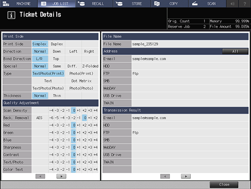 8 | [Details] | Pressed for a job to be checked in detail after you select it from the list. The [Ticket Details] screen for the selected job is displayed. |