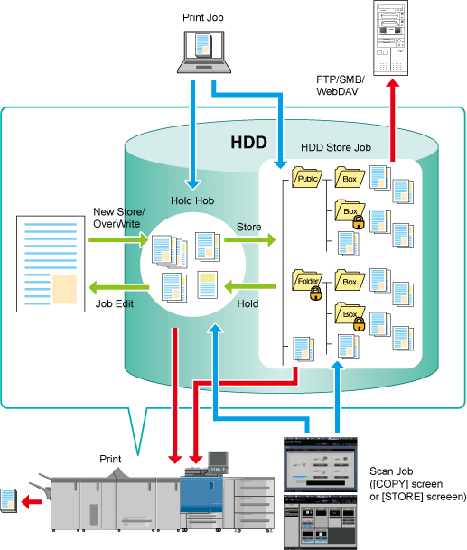 You can save a job data scanned using this machine (a job scanned on the [COPY] Screen and [STORE] Screen) and a print job from a computer as a hold job or HDD saved job.