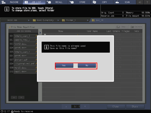 If the file name of the job has been duplicated, a confirmation dialog will be displayed. Press [Yes] to save it or press [No] to cancel.