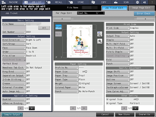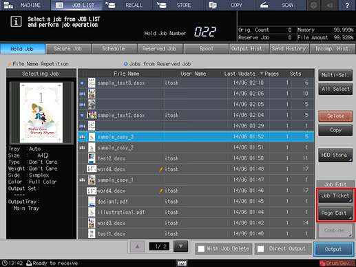 4. Press [Job Ticket] or [Page Edit]. Pressing [Job Ticket] displays the [Job Ticket Edit] screen and allows you to edit print settings. Pressing [Page Edit] displays the [Image Page Edit] screen and allows you to edit a job on a page basis.