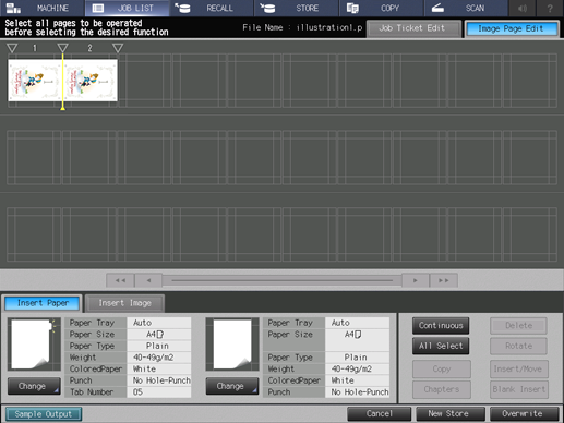 Provides preview images of the page sequence. This function also allows you to insert, move, or copy the images or sheets (covers).