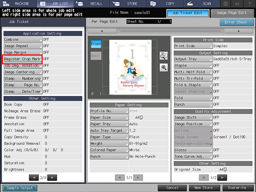 Press [Sample Output] to output and check the changed setting. One set, a sheet in the preview, or a sheet can be specified as an output target.