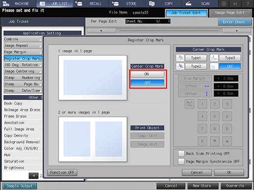 Use this function to print the lines indicating the trim size (corner crop marks) along with image data stored in a hold job. Also, lines indicating the center of the image (center crop marks) can be printed on the head and foot of the page.