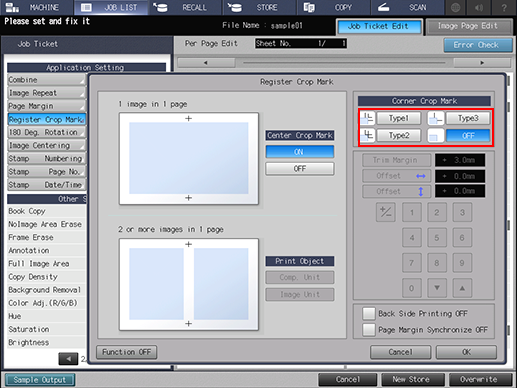 This section describes the Register Crop Mark function to be specified on the [Job Ticket Edit] screen.