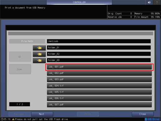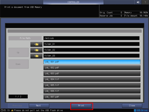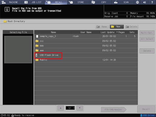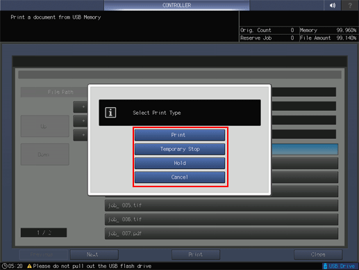 If [USB Flash Drive] is not displayed, set [USB Direct Print] to [Allow] in the Utility menu. For details, refer to Function Usage Restriction Setting: Restricting the machine functions.