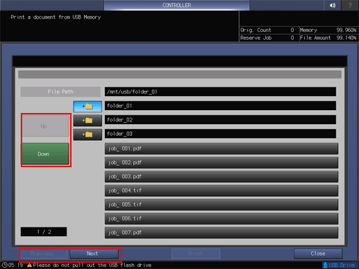 To move between folders in the USB flash drive, select a folder, then press [Down] or [Up].