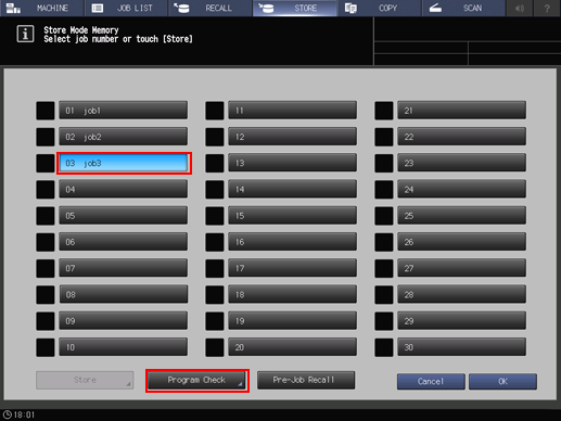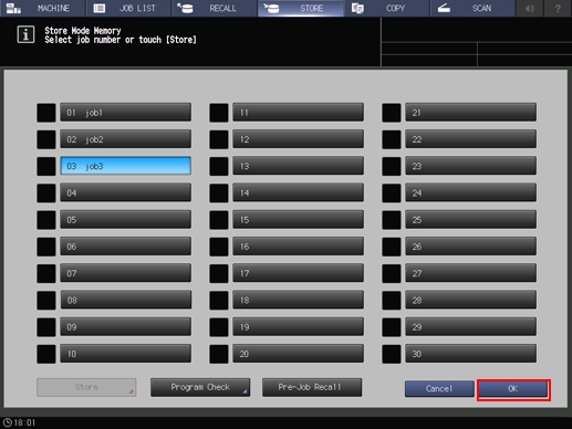 • To display the [Store Mode Memory] screen, display the [STORE] screen, and then press Mode Memory on the control panel. When the [MACHINE] or other screen is displayed, the [Store Mode Memory] screen is not displayed.