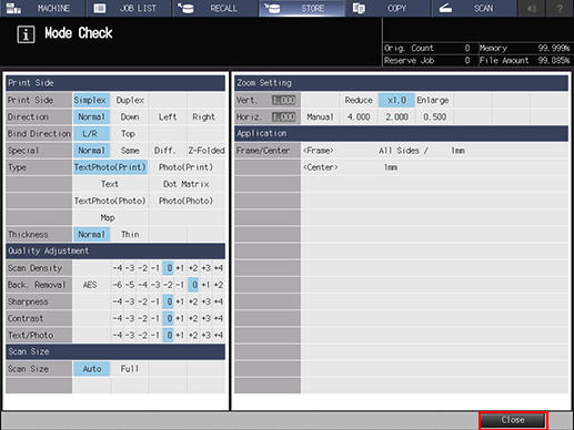 • Left side area of the [Mode Check] screen: Displays the current settings of Print Side, Quality Adjustment, and Scan Size.