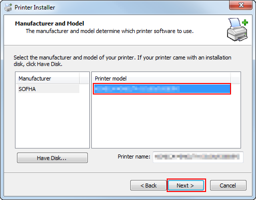 Select the printer model and click [Next].