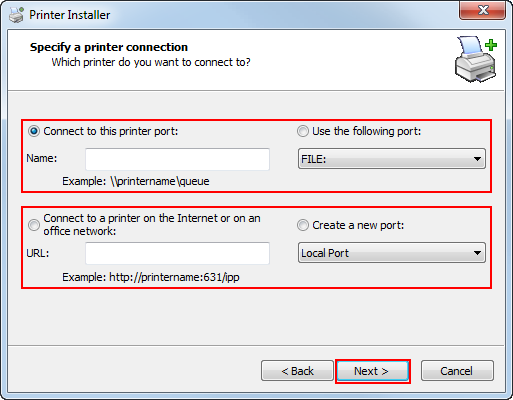 If selecting [Network printer name or IP Address], click [Next] to go to Step 6.