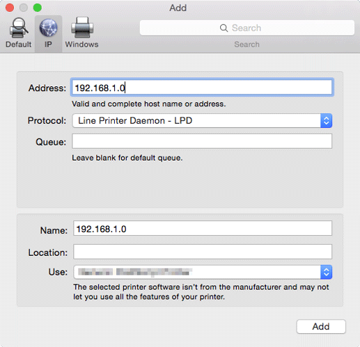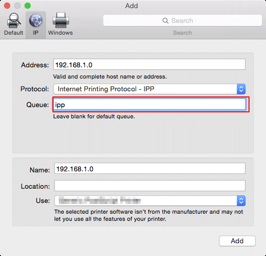 In [Address:], enter the IP address for this machine. In [Queue], enter "ipp".