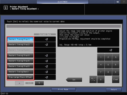 2. Press [Machine Adjustment], [Printer Adjustment], and [Restart Timing Adjustment] in sequence.