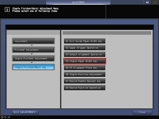 Press [Finisher Adjustment], [Staple Finisher Adjustment], [Staple Finisher(Main) Adj.], and [Staple Paper Width Adj.] in sequence.
