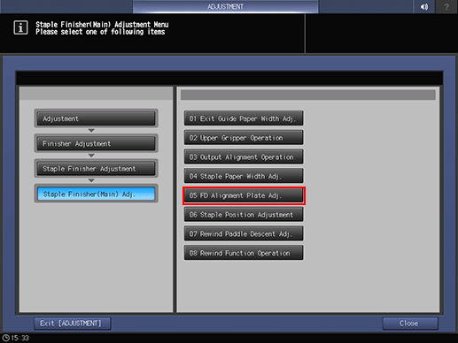 Press [Finisher Adjustment], [Staple Finisher Adjustment], [Staple Finisher(Main) Adj.], and [FD Alignment Plate Adj.] in sequence.