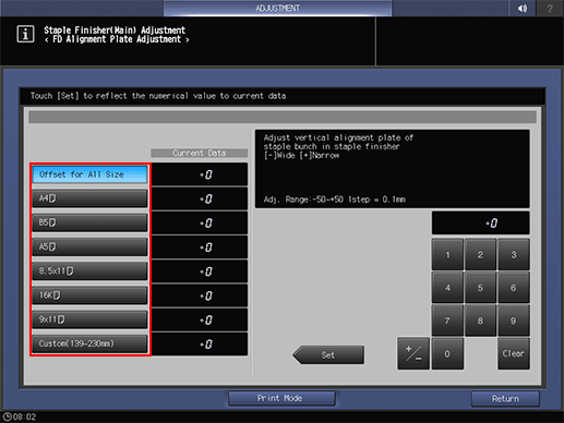 If a numeric value is specified for [Offset for All Size], it is applied to all paper sizes. With a specific paper size selected,the set value becomes the sum of the entered value and the value previously specified for [Offset for All Size].