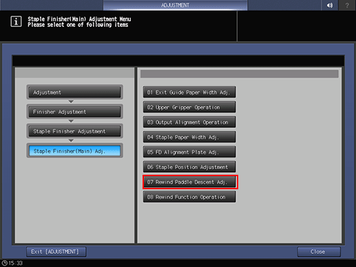Press [Finisher Adjustment], [Staple Finisher Adjustment], [Staple Finisher(Main) Adj.], and [Rewind Paddle Descent Adj.] in sequence.
