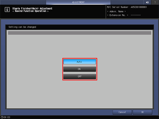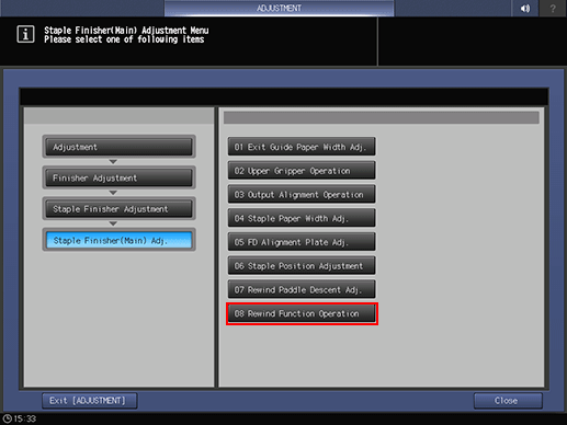 Press [Finisher Adjustment], [Staple Finisher Adjustment], [Staple Finisher(Main) Adj.], and [Rewind Function Operation] in sequence.