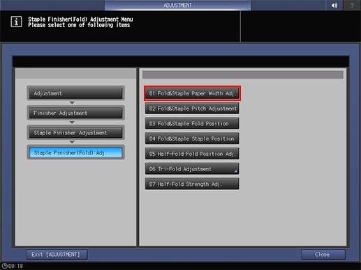 Press [Finisher Adjustment], [Staple Finisher Adjustment], [Staple Finisher(Fold) Adj.], [Fold&Staple Paper Width Adj.] in sequence.