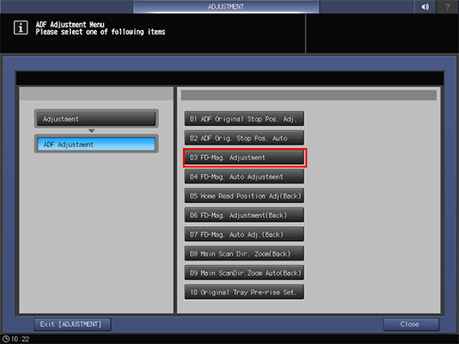 Press [ADF Adjustment] and [FD-Mag. Adjustment] in sequence.