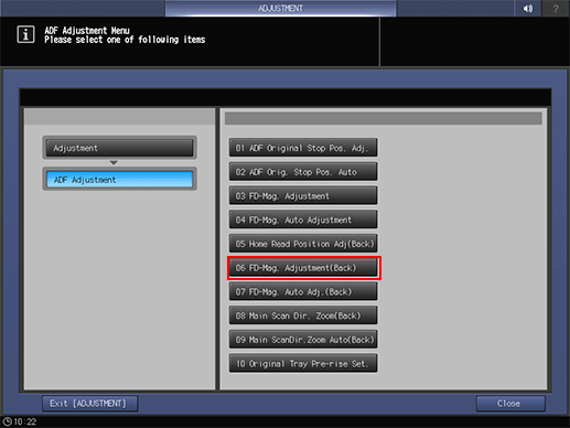 Press [ADF Adjustment] and [FD-Mag. Adjustment(Back)] in sequence.