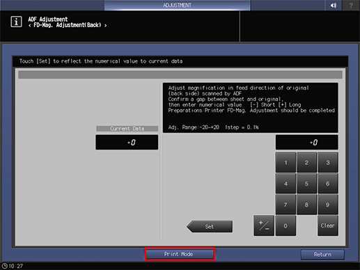 If any adjustment is required, press [Exit PrintMode] to return to the [FD-Mag. Adjustment(Back)] screen.
