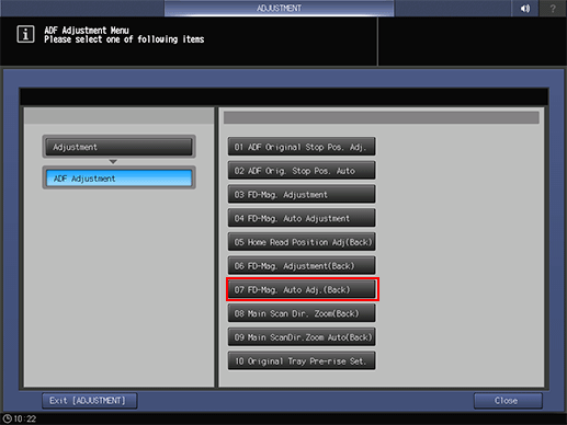 Press [ADF Adjustment] and [FD-Mag. Auto Adj.(Back)] in sequence.