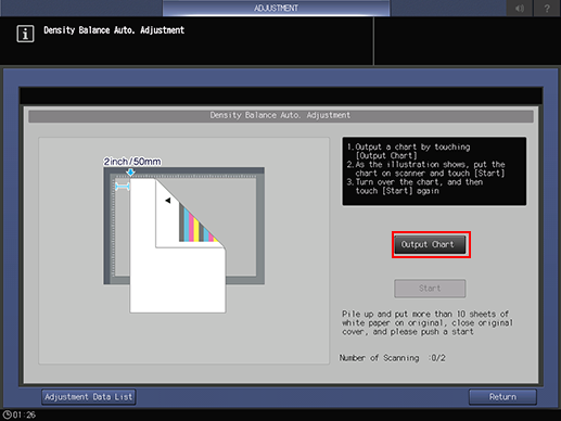 A test chart is printed, and the [Density Balance Auto. Adjustment] screen is displayed.