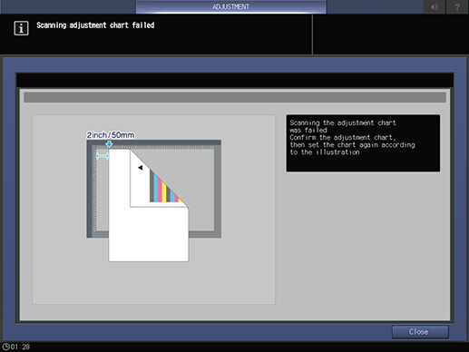Take the test chart away from the vertical size guide by 2 inches (50mm), then push it against the horizontal size guide to load the test chart.