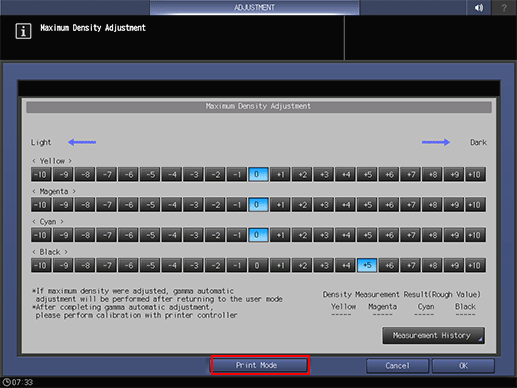 After outputting the charts, the screen returns to the Maximum Density Adjustment screen and the measurement result is displayed under "Density Measurement Result (Rough Value)" in the lower right of the screen.