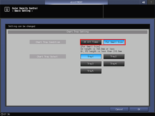 To feed paper from the tray being set by [Chart Tray Select] during output of all charts for Color Density Control, select [At All Times]. To feed paper from the tray being set by [Chart Tray Select] during output of small size charts, select [For Small Size].