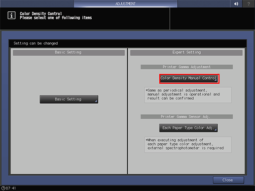 Manually perform the gamma correction using the density sensor of Relay Unit RU-509 (hereinafter, referred to as "manual adjustment"). Manual adjustment is performed when you want to update Color Density Control by optional readjustment.