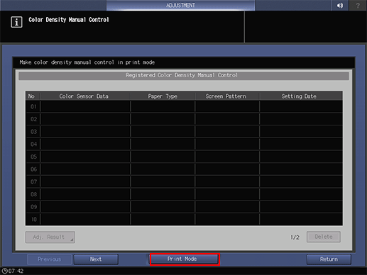 The list displayed on the [Color Density Manual Control] screen is the history of the Color Density Manual Control. To clear the history, select the desired row (data) from the list, then press [Delete]. Do not select the row (data) on the list except when deleting it or displaying [Adj. Result]. Otherwise, the [PRINT MODE] screen cannot be displayed.