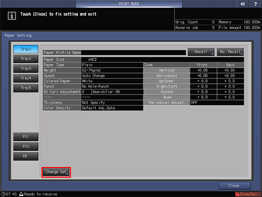 Press [Paper Setting] on the [PRINT MODE] screen to display the [Paper Setting] screen, and then press [Change Set].