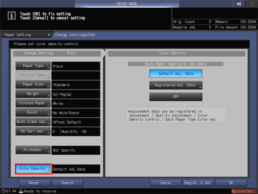 You can also display the [Color Density Manual Control] screen by pressing [Color Dens. Manual] on the [MACHINE] screen.