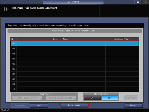 4. Select any row from [Each Paper Type Color Adjustment List], and press [Print Mode].