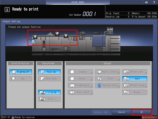 1. Set the paper type and screen for the color sensor adjustment data for each paper type, and then output the chart from the machine.