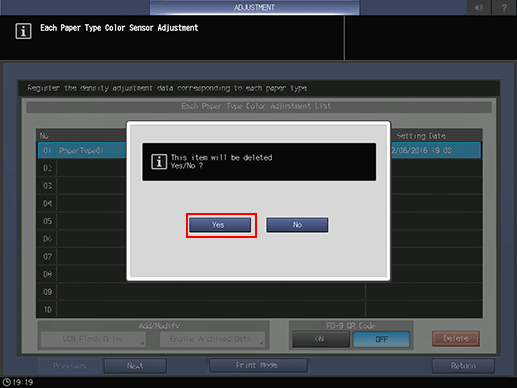 • Once you have deleted the color sensor adjustment data for each paper type, you cannot recover it. Please be careful in deletion.