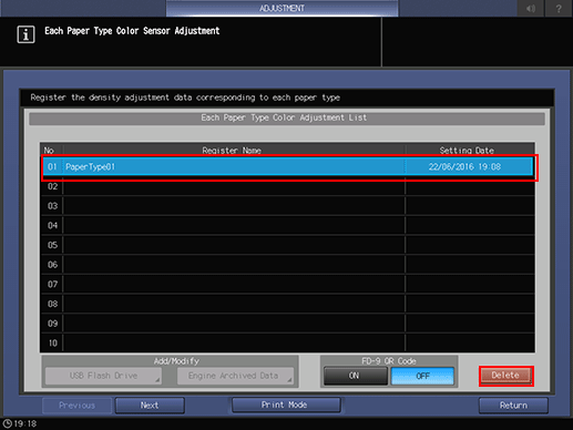 4. Select a row you wish to delete from [Each Paper Type Color Adjustment List], and press [Delete].