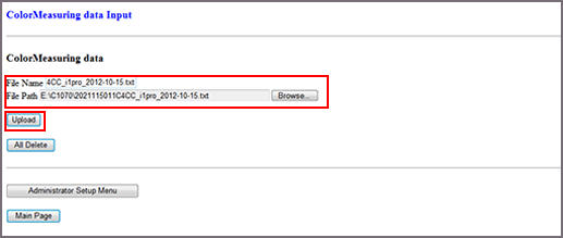 • Multiple sets of colorimetric data registered via Web is displayed on the [Colored Data File Select] screen.