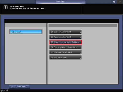 Press [Adjustment] on the [MACHINE] screen to display the [Adjustment Menu] screen.