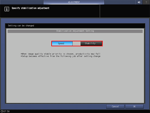 If you select the [Stability], you can set a density adjustment frequency using Administrator Setting. Refer to Stabilization Adj. Setting: Selecting Priority of Output Speed and Image Quality for details.