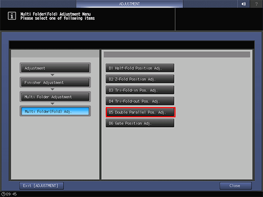 2. Press [Finisher Adjustment], [Multi Folder Adjustment], [Multi Folder (Fold) Adj.], and [Double Parallel Pos. Adj.] in sequence.