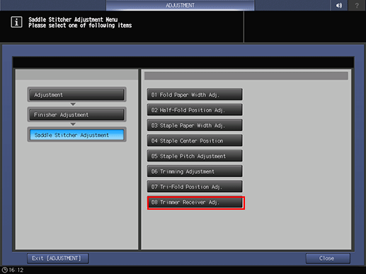 Press [Finisher Adjustment], [Saddle Stitcher Adjustment], and [Trimmer Receiver Adj.] in sequence.