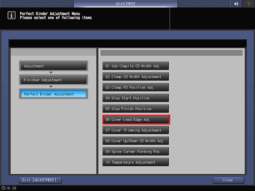 The screen returns to the [Perfect Binder Adjustment Menu] screen.