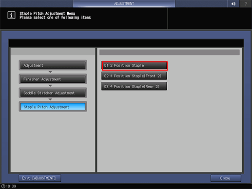 Press [Finisher Adjustment], [Saddle Stitcher Adjustment], [Staple Pitch Adjustment], and [2 Position Staple] in sequence.