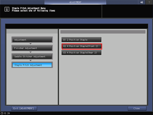 Press [Finisher Adjustment], [Saddle Stitcher Adjustment], [Staple Pitch Adjustment], and [4 Position Staple(Front 2)] in sequence.